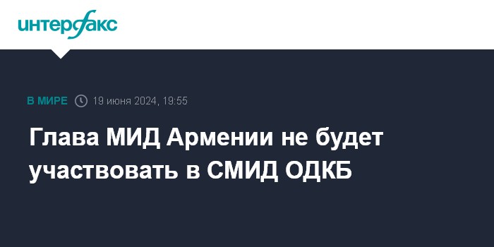Москва. 19 июня. INTERFAX.RU - Глава МИД Армении Арарат Мирзоян не примет участия в заседании Совета министров иностранных дел стран ОДКБ, заявила пресс-секретарь МИД Армении Ани Бадалян.