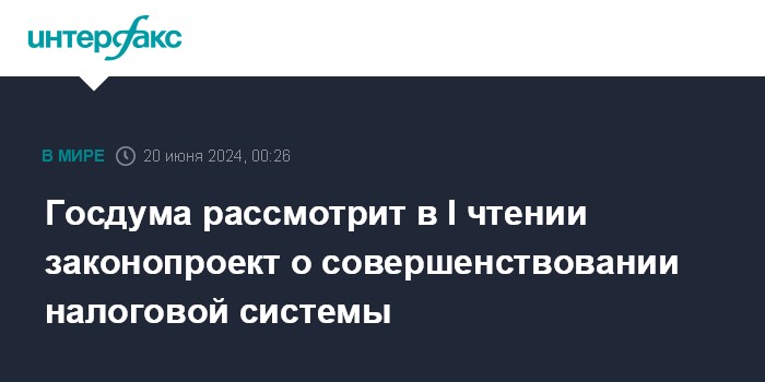 Москва. 20 июня. INTERFAX.RU - Госдума на заседании в четверг планирует рассмотреть в первом чтении законопроект о совершенствовании налоговой системы, поправки включают в себя повышение с 1 января 2025 г. налога на прибыль с 20% до 25%, рост ряда рентных налогов и введение дифференцированного НДФЛ в зависимости от размера и вида полученного гражданином дохода.