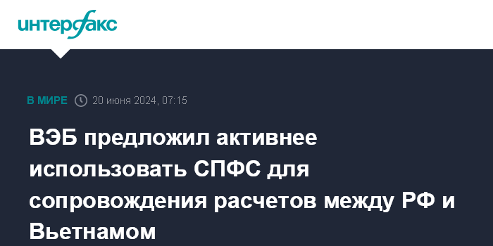Москва. 20 июня. INTERFAX.RU - ВЭБ предлагает активнее использовать систему передачи финансовых сообщений (СПФС) или альтернативные системы для сопровождения расчетов с Вьетнамом.