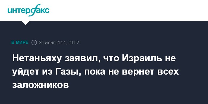 Москва. 20 июня. INTERFAX.RU - Армия обороны Израиля (ЦАХАЛ) не покинет сектор Газа, пока не освободит всех заложников и не уничтожит военные возможности палестинского движения ХАМАС, заявил в четверг израильский премьер Биньямин Нетаньяху.