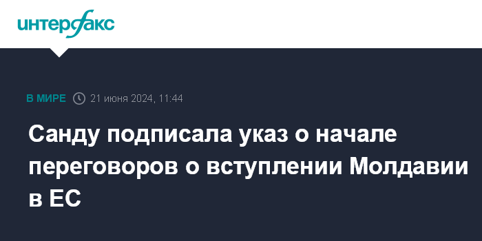 Москва. 21 июня. INTERFAX.RU - Президент Молдавии Майя Санду сообщила в пятницу, что подписала указ об открытии переговоров по присоединению республики к Европейскому союзу.