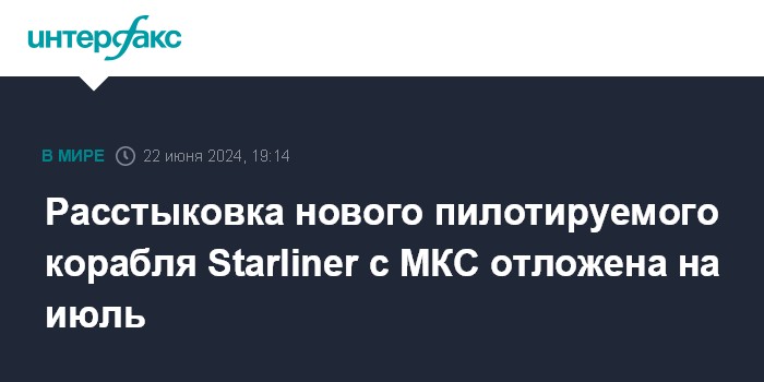 Москва. 22 июня. INTERFAX.RU - Расстыковка с Международной космической станцией (МКС) нового американского пилотируемого корабля Starliner откладывается на июль, следует из данных NASA.