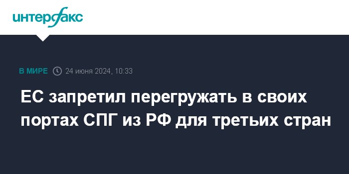 Москва. 24 июня. INTERFAX.RU - Евросоюз в рамках 14-го пакета антироссийских санкций введет запрет на перегрузку в портах союза российского сжиженного природного газа (СПГ) для поставок в третьи страны, сообщает Совет ЕС.