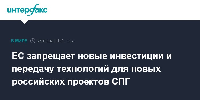 Москва. 24 июня. INTERFAX.RU - Власти ЕС в рамках 14-го пакета санкций запретят новые инвестиции и передачу технологий для завершения российских проектов по сжижению природного газа (СПГ), сообщает Совет ЕС.