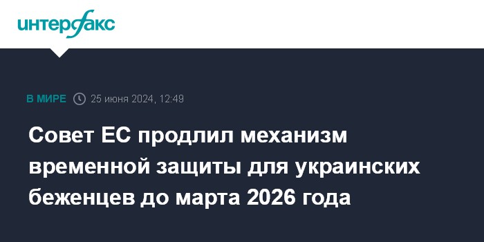 Москва. 25 июня. INTERFAX.RU - Совет ЕС объявил во вторник о решении продлить временную защиту для более чем 4 млн украинских беженцев до 4 марта 2026 года.