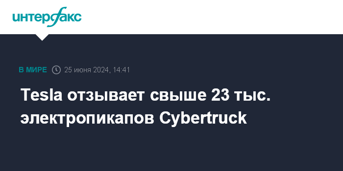 Москва. 25 июня. INTERFAX.RU - Американская Tesla отзывает более 23 тыс. электропикапов Cybertruck, сообщается на сайте Национального управления по безопасности дорожного движения США (NHTSA).