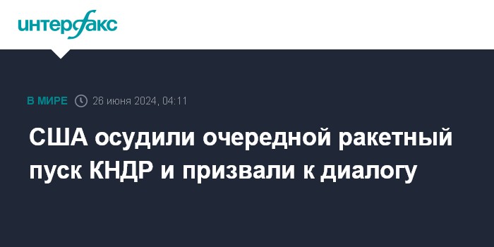 Москва. 26 июня. INTERFAX.RU - Соединенные Штаты осудили запуск КНДР баллистической ракеты, отметив, что это является нарушением резолюций Совета безопасности ООН, сообщило агентство "Ренхап".