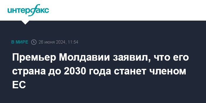Москва. 26 июня. INTERFAX.RU - Премьер-министр Молдавии Дорин Речан выразил уверенность, что к 2030 году республика будет готова к членству в Европейском союзе, хотя и признал, что объявленная Кишиневом цель "слишком амбициозна".