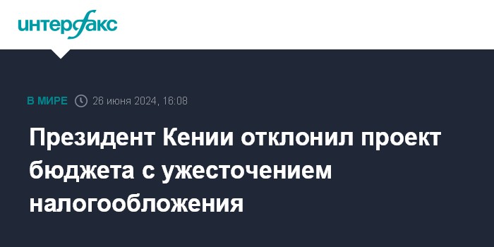 Москва. 26 июня. INTERFAX.RU - Президент Кении Уильям Руто на фоне массовых протестов отказался подписать проект бюджета, в соответствии с которым планировалось ужесточить налогообложение, сообщает в среду кенийская газета The Star со ссылкой на источники.