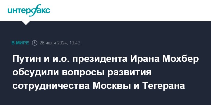 Путин и и.о. президента Ирана Мохбер обсудили вопросы развития сотрудничества Москвы и Тегерана