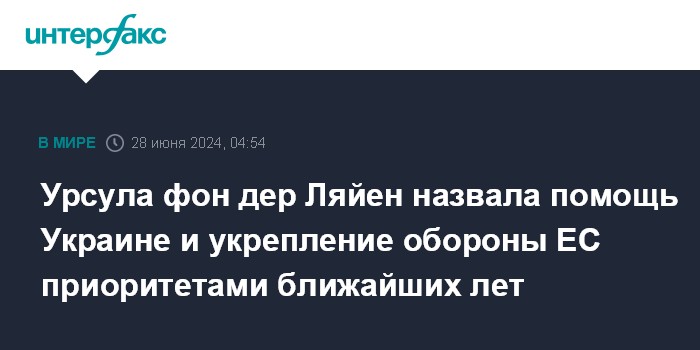 Москва. 28 июня. INTERFAX.RU - Глава Еврокомиссии (ЕК) Урсула фон дер Ляйен, определяя приоритеты на предстоящий институциональный цикл ЕС, особо выделила помощь Украине и необходимость увеличения оборонных расходов сообщества.