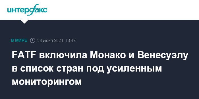 Москва. 28 июня. INTERFAX.RU - FATF (Группа разработки финансовых мер по борьбе с отмыванием денег – Financial Action Task Force, FATF) включила Монако и Венесуэлу в так называемый серый список, то есть перечень юрисдикций, которые находятся под усиленным мониторингом организации; статус России остался прежним – ее членство в группе приостановлено.