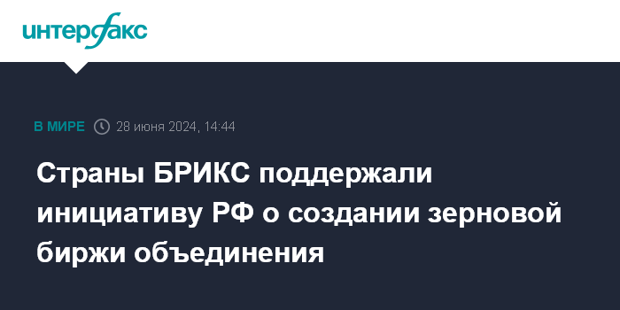 Москва. 28 июня. INTERFAX.RU - Страны БРИКС поддержали инициативу РФ по созданию зерновой биржи объединения, начинают работу в этом направлении.
