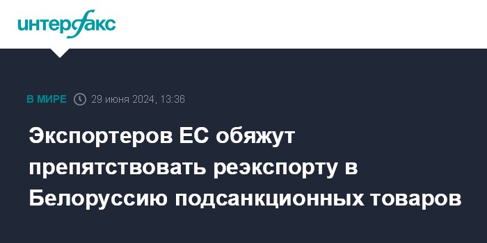 Москва. 29 июня. INTERFAX.RU - Экспортеров ЕС обяжут препятствовать реэкспорту в Белоруссию подсанкционных товаров, соответствующее решение опубликовано в субботу на официальном сайте Совета.