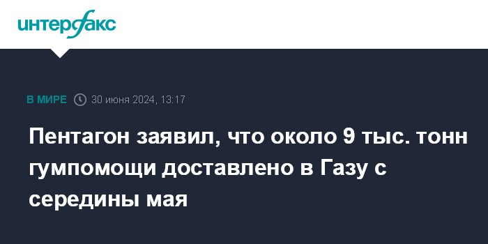 Пентагон заявил, что около 9 тыс. тонн гумпомощи доставлено в Газу с середины мая