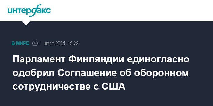Москва. 1 июля. INTERFAX.RU - Парламент Финляндии единогласно одобрил Соглашение об оборонном сотрудничестве с США.