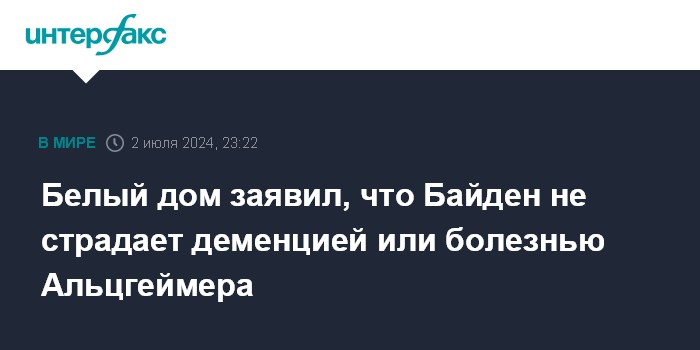 Москва. 2 июля. INTERFAX.RU - Президент США Джо Байден не страдает деменцией или болезнью Альцгеймера, заявила во вторник пресс-секретарь Белого дома Карин Жан-Пьер.