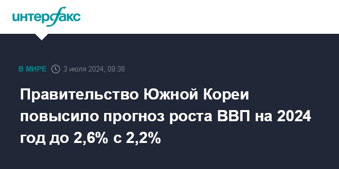 Москва. 3 июля. INTERFAX.RU - Правительство Южной Кореи повысило прогноз роста ВВП на 2024 год до 2,6% с ожидавшихся ранее 2,2%.