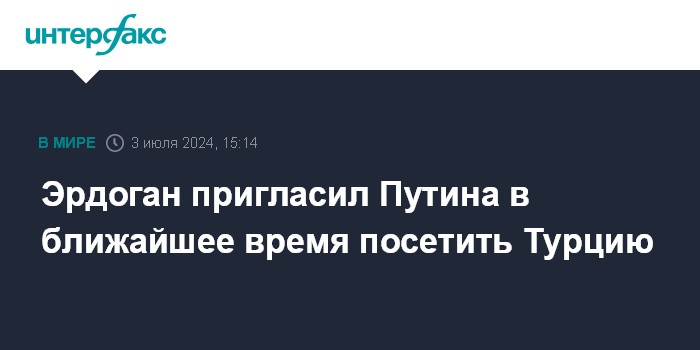 Москва. 3 июля. INTERFAX.RU - Президент Турции Реджеп Тайип Эрдоган заявил, что ждет российского коллегу Владимира Путина с визитом в своей стране в кратчайшие сроки.