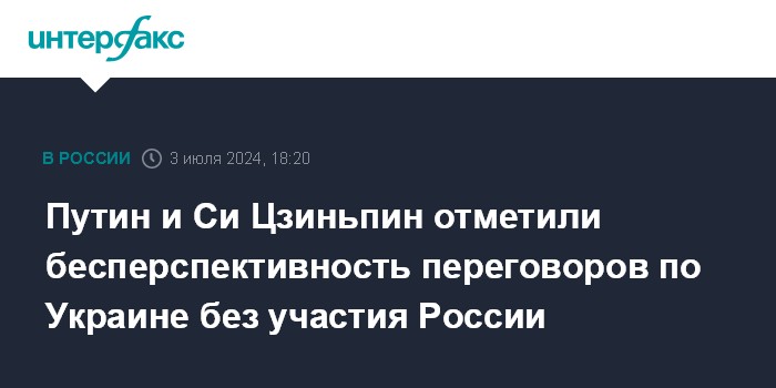 Москва. 3 июля. INTERFAX.RU - Президент России Владимир Путин на переговорах с председателем КНР Си Цзиньпином отметили бесперспективность любых форматов по урегулированию ситуации на Украине без участия России, заявил пресс-секретарь Путина Дмитрий Песков программе "Москва. Кремль. Путин" телеканала Россия-1.