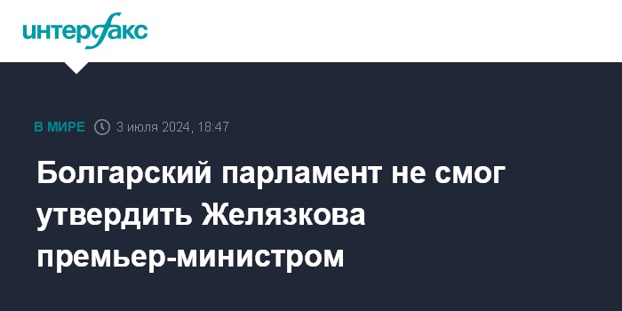 Москва. 3 июля. INTERFAX.RU - Депутаты Национального собрания Болгарии проголосовали против кандидатуры Росена Желязкова на пост премьер-министра, сообщает Болгарское национальное телевидение.