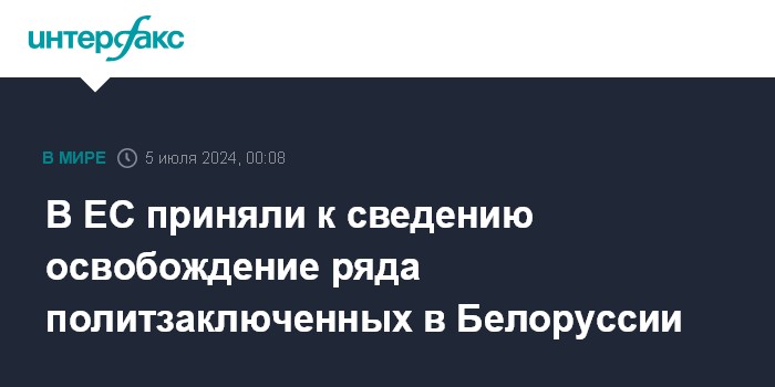 Москва. 5 июля. INTERFAX.RU - Официальный представитель Европейской внешнеполитической службы (ЕВС) заявил, что Евросоюз принимает к сведению освобождение ряда политзаключенных в Белоруссии.