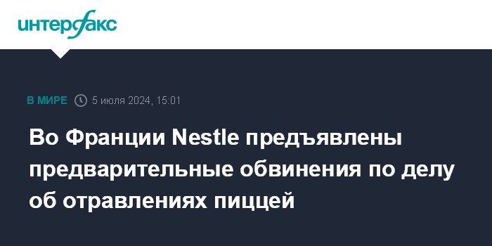 Москва. 5 июля. INTERFAX.RU - Во Франции прокуратура предъявила швейцарской Nestle и ее местной структуре Société des Produits Alimentaires de Caudry (SPAC) предварительные обвинения в непреднамеренном убийстве по делу о массовом отравлении замороженной пиццей Buitoni, сообщает MarketWatch со ссылкой на пресс-релиз Nestlе.