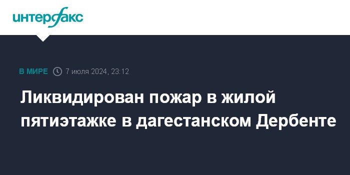 Москва. 7 июля. INTERFAX.RU - Пожарные полностью ликвидировали возгорание в пятиэтажном многоквартирном доме в дагестанском Дербенте, сообщили "Интерфаксу" в пресс-службе ГУ МЧС России по республике в воскресенье вечером.