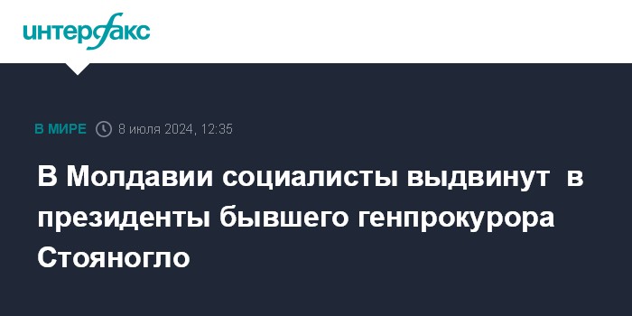 Москва. 8 июля. INTERFAX.RU - Партия социалистов Молдавии (ПСРМ) предложила бывшего генерального прокурора страны Александра Стояногло в качестве единого кандидата от всех оппозиционных сил на пост президента Молдавии. Об этом на брифинге объявил лидер партии Игорь Додон.