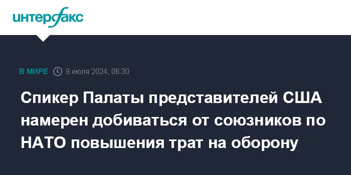 Москва. 9 июля. INTERFAX.RU - Спикер американской палаты представителей Майк Джонсон заявил, что он на встречах с представителями стран НАТО в рамках вашингтонского саммита альянса будет добиваться выполнения ими обязательств о выделении на оборону установленных 2% ВВП, сообщает Politico.