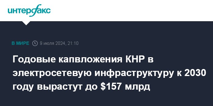 Годовые капвложения КНР в электросетевую инфраструктуру к 2030 году вырастут до $157 млрд