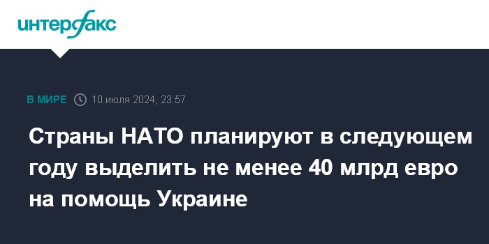 Москва. 10 июля. INTERFAX.RU - Лидеры стран-членов НАТО объявили о планах выделить не менее 40 млрд евро на оказание помощи Украине в течение следующего года, говорится в распространенном в среду заявлении по итогам саммита альянса.
