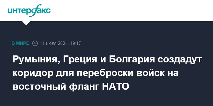 Москва. 11 июля. INTERFAX.RU - Министры обороны Румынии, Греции и Болгарии подписали соглашение о намерении создать коридор для быстрого перемещения военнослужащих и вооружений на восточный фланг НАТО, сообщается на сайте министерства обороны Румынии в четверг.