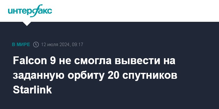 Москва. 11 июля. INTERFAX.RU - Ракета-носитель Falcon 9 в пятницу по московскому времени не смогла вывести на заданную орбиту очередную партию из 20 мини-спутников для пополнения орбитальной группировки глобальной сети интернет-покрытия системы Starlink, сообщила компания-разработчик SpaceX.