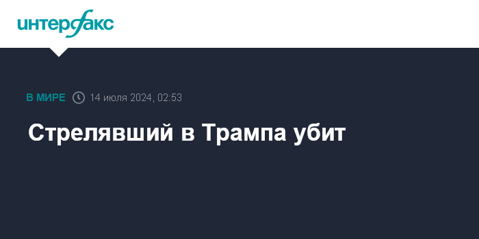 Москва. 14 июля. INTERFAX.RU - Человек, ранивший экс-президента США Дональда Трампа на предвыборном митинге в Пенсильвании, убит, сообщил телеканал Fox News со ссылкой на источники в правоохранительных органах.
