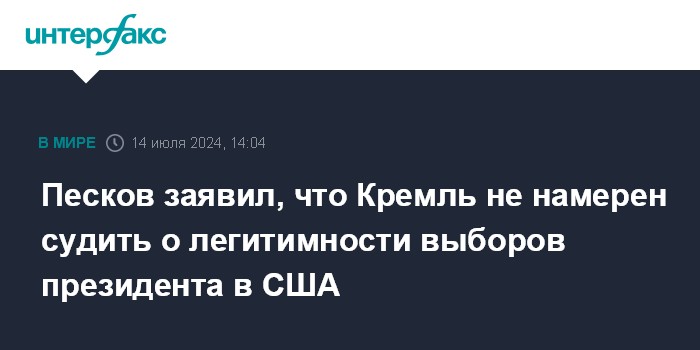 Москва. 14 июля. INTERFAX.RU - Вопрос о том, повлияет ли покушение на Дональда Трампа на легитимность итогов президентских выборов в США, является внутренним делом этой страны, заявил пресс-секретарь президента РФ Дмитрий Песков.