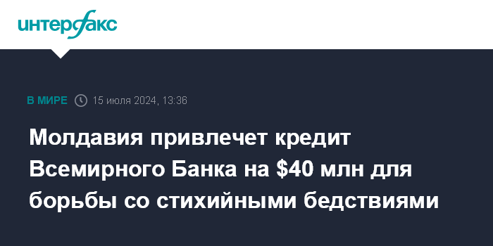 Москва. 15 июля. INTERFAX.RU - Парламент Молдавии одобрил привлечение пятилетнего кредита Всемирного банка на $40 млн для реализации проекта управления рисками стихийных бедствий и поддержки устойчивости, сообщила пресс-служба парламента.