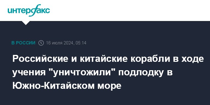 "Морская часть военно-морского учения ВМФ РФ и ВМС НОАК "Морское взаимодействие - 2024" началась с отработки противолодочного эпизода, в ходе которого совместными усилиями в акватории Южно-Китайского моря была обнаружена и условно уничтожена "вражеская" подводная лодка, - говорится в сообщении. - В ходе практических действий боевые расчёты российских и китайских кораблей выполнили стрельбу из реактивных бомбомётных установок".