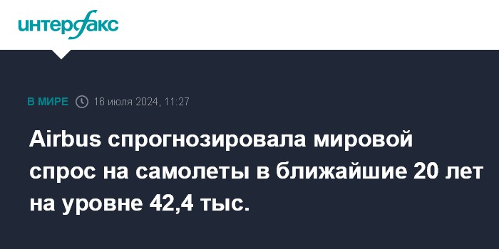 Москва. 16 июля. INTERFAX.RU - Глобальный спрос на новые пассажирские и грузовые самолеты в 2024-2043 годах составит 42,430 тыс. воздушных судов, прогнозирует европейская аэрокосмическая корпорация Airbus.