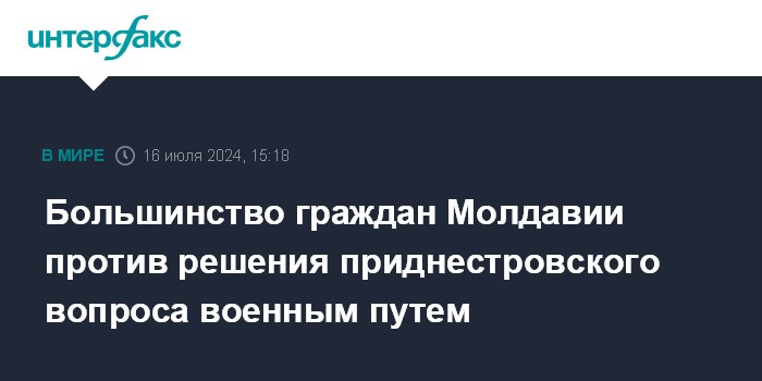 Москва. 16 июля. INTERFAX.RU - Подавляющее большинство граждан Молдавии - 75,8% - против решения приднестровского конфликта военным путем, показал опрос, проведенный компанией CBS-Research по заказу Фонда Конрада Аденауэра в Молдове.