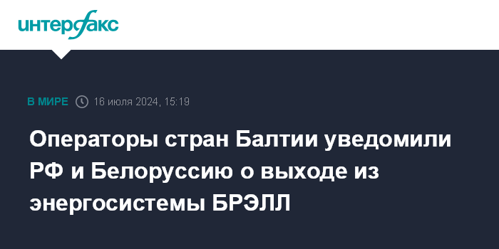 Москва. 16 июля. INTERFAX.RU - Балтийские операторы систем передачи электроэнергии Litgrid (Литва), AST (Латвия) и Elering (Эстония) во вторник уведомили Россию и Белоруссию о непродлении совместного соглашения о параллельной работе энергосистем (кольцо БРЭЛЛ - Белоруссия, Россия, Эстония, Латвия, Литва), подписанного в 2001 году.