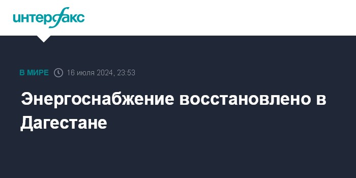 Москва. 16 июля. INTERFAX.RU - Электроснабжение ряда населенных пунктов Дагестана, частично обесточенных из-за сбоя в работе генерирующего оборудования на Ростовской АЭС, восстановлено.