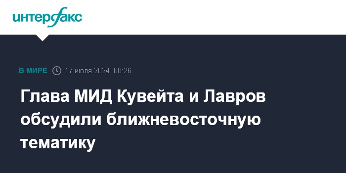 Москва. 17 июля. INTERFAX.RU - Глава МИД РФ Сергей Лавров на встрече с главой МИД Кувейта Абдаллой Аль-Яхьей обсудил международную и ближневосточную повестку дня с акцентом на развитие ситуации в зоне палестино-израильского конфликта, сообщил МИД РФ.