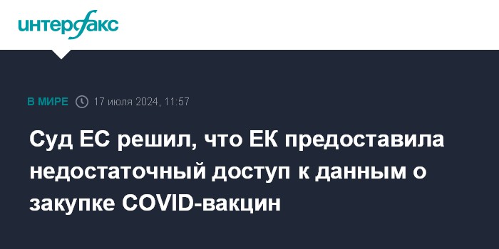 Москва. 17 июля. INTERFAX.RU - Суд Европейского союза постановил, что Еврокомиссия не предоставила общественности достаточный доступ к информации о закупках вакцин от коронавируса COVID-19, сообщается в среду на сайте суда.