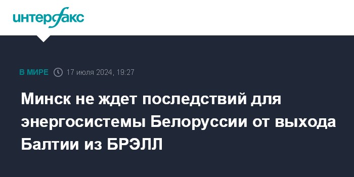 Москва. 17 июля. INTERFAX.RU - Выход стран Балтии из энергокольца БРЭЛЛ (Белоруссии, России, Эстонии, Латвии и Литвы) никак не повлияет на работу энергосистемы Белоруссии, заявили в пресс-службе Минэнерго республики.