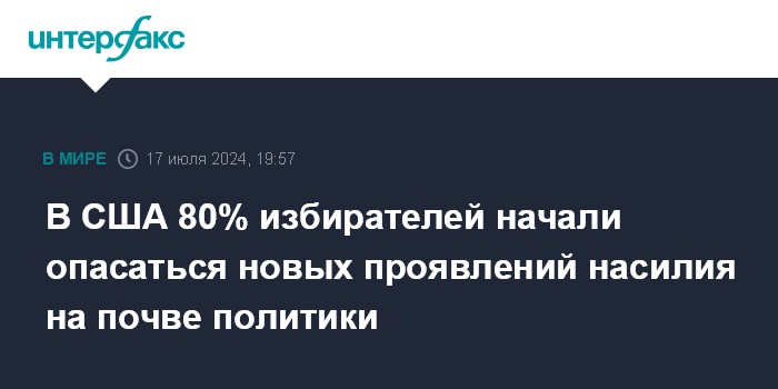 Москва. 17 июля. INTERFAX.RU - В США 80% зарегистрированных избирателей начали беспокоиться о том, что вслед за покушением на экс-президента Дональда Трампа последуют новые акты насилия по политическим мотивам, сообщает The Hill со ссылкой на опрос Reuters/Ipsos.