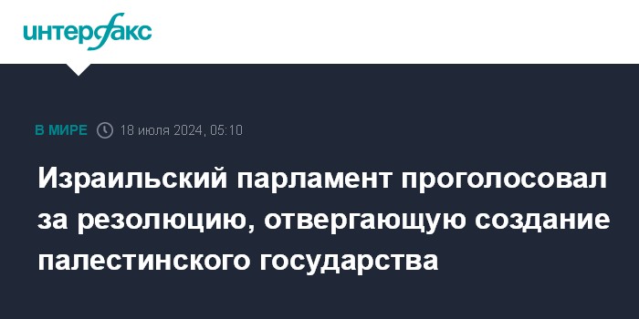 Москва. 18 июля. INTERFAX.RU - Кнессет (парламент) Израиля подавляющим большинством голосов проголосовал за принятие резолюции, отвергающей создание палестинского государства, сообщила The Times of Israel.