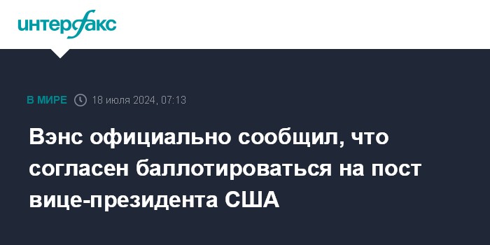 Вэнс официально сообщил, что согласен баллотироваться на пост вице-президента США