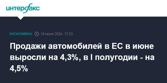 В первом полугодии продажи автомобилей в ЕС выросли на 4,5%, составив 5,684 млн. Продажи электромобилей увеличились на 1,3% - до 712 637 штук.
