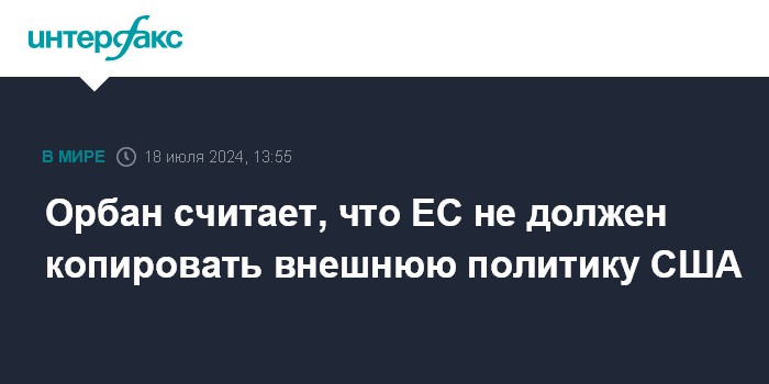 Москва. 18 июля. INTERFAX.RU - Премьер-министр Венгрии Виктор Орбан заявил в четверг, что Евросоюз должен выстраивать свою собственную внешнюю политику, не копируя подход нынешней американской администрации.